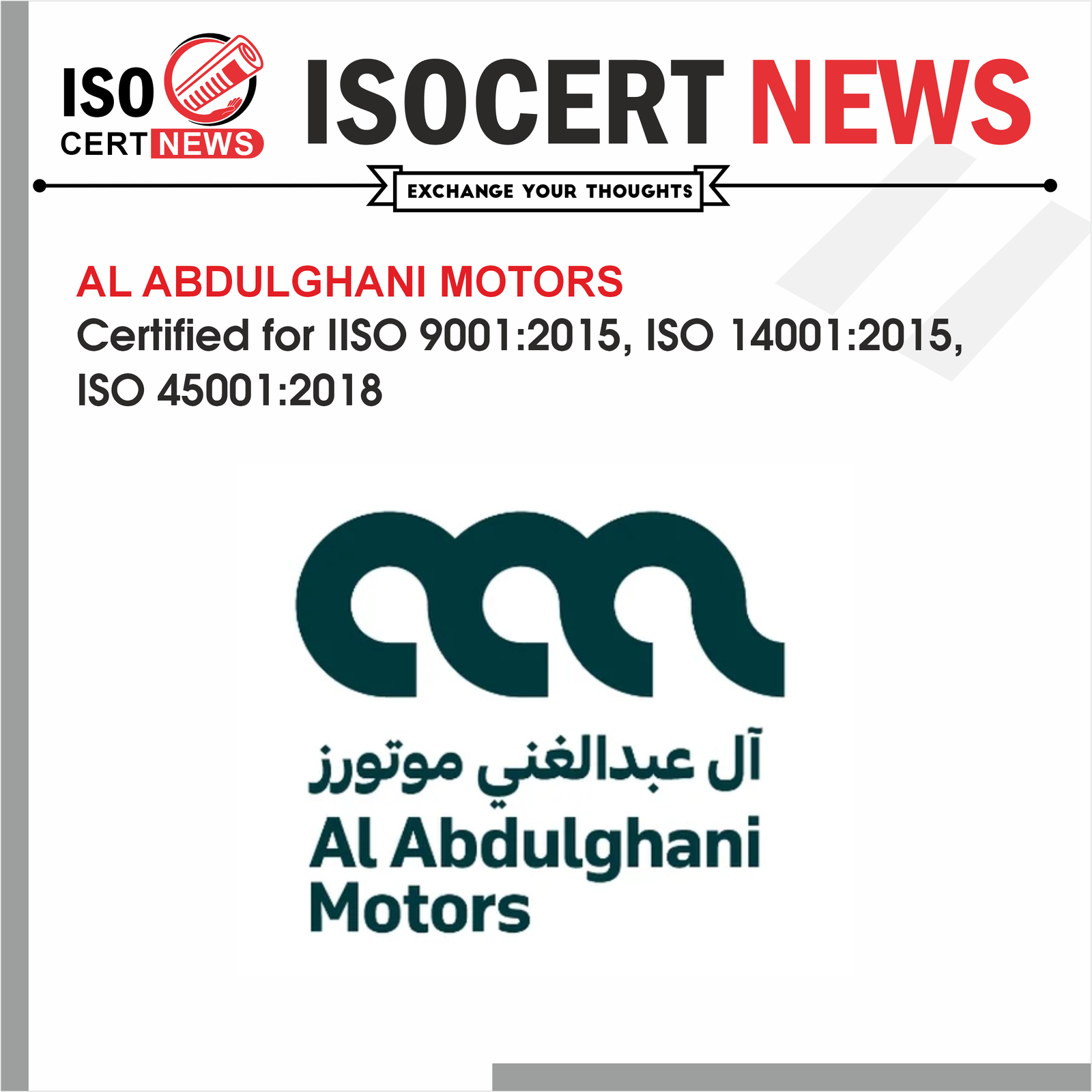 - By achieving ISO 45001 Certification, AL ABDULGHANI MOTORS clearly demonstrates that employee health and safety is a top priority, enhancing stakeholder confidence and supporting new business opportunities.