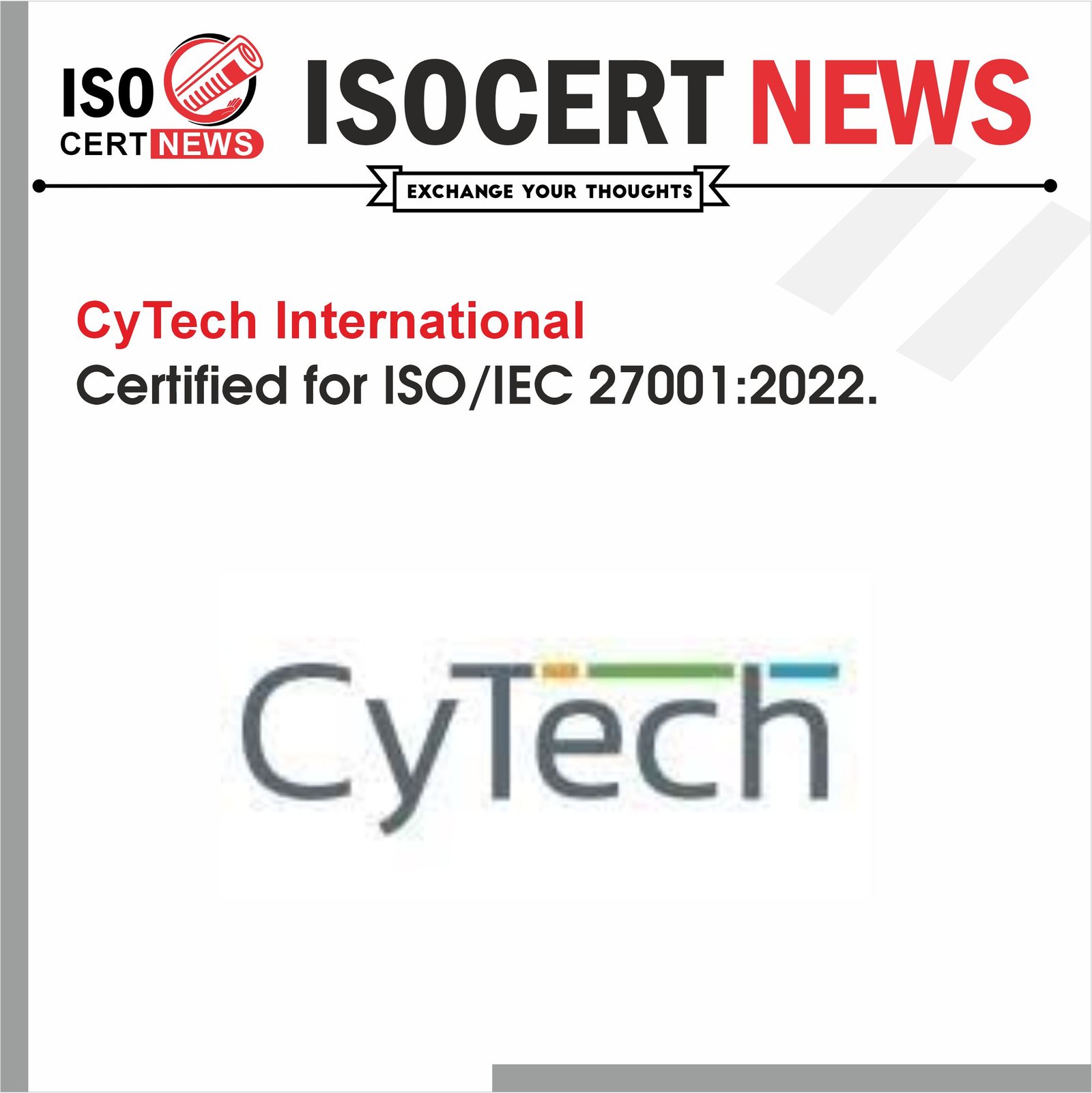 CyTech International has achieved ISO/IEC 27001:2022 Certification for Information Security, Cybersecurity and Privacy Protection — Information Security Management System (ISMS). Moreover, the standard demonstrates the organization’s commitment to maintaining the appropriate safety and data privacy standards.