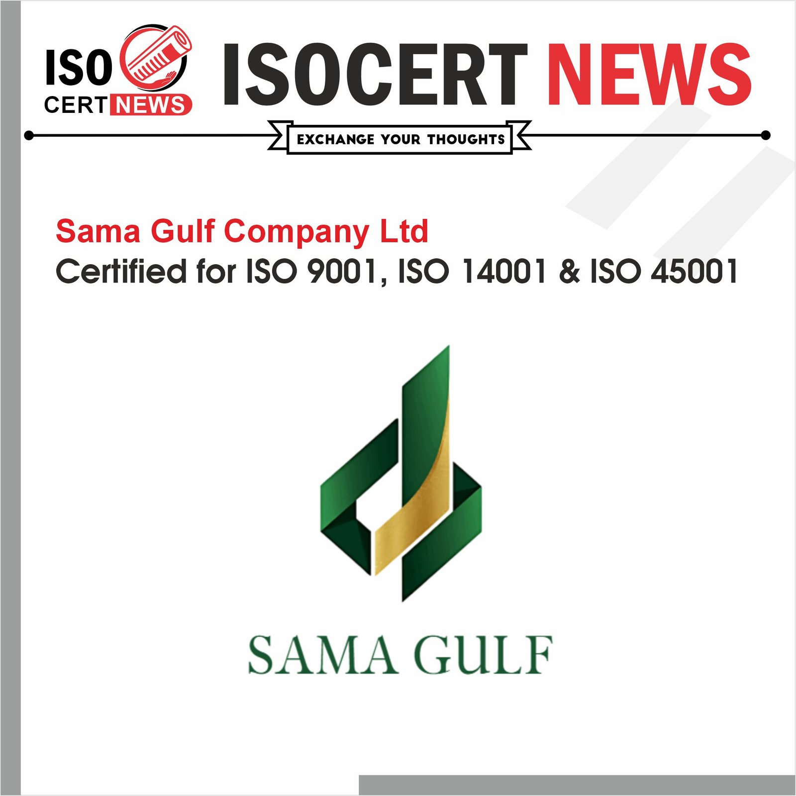 Demonstrating its dedication to a holistic approach towards quality excellence, environmental protection, and employee health and safety, Sama Gulf Company Ltd has successfully maintained ISO 9001:2015, ISO 14001:2015, and ISO 45001:2018 certifications following a surveillance audit. These certifications were awarded by an IAS-accredited certification body, reflecting the company’s commitment to the adoption and implementation of an integrated management system to optimize performance outcomes.