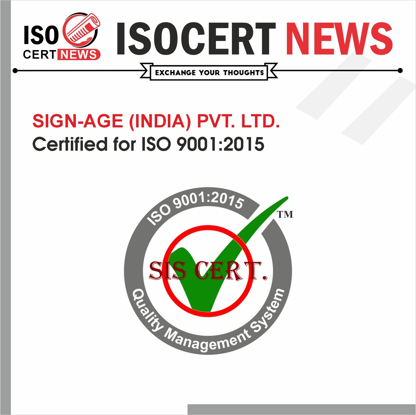 SIGN-AGE (INDIA) PVT. LTD. has achieved ISO 9001:2015 certification from an IAS-accredited certification body for its quality management system. The attainment of this certification demonstrates SIGN-AGE (INDIA) PVT. LTD.’s commitment to quality, with customer satisfaction at its center, continual improvement, and risk management in its ongoing processes.